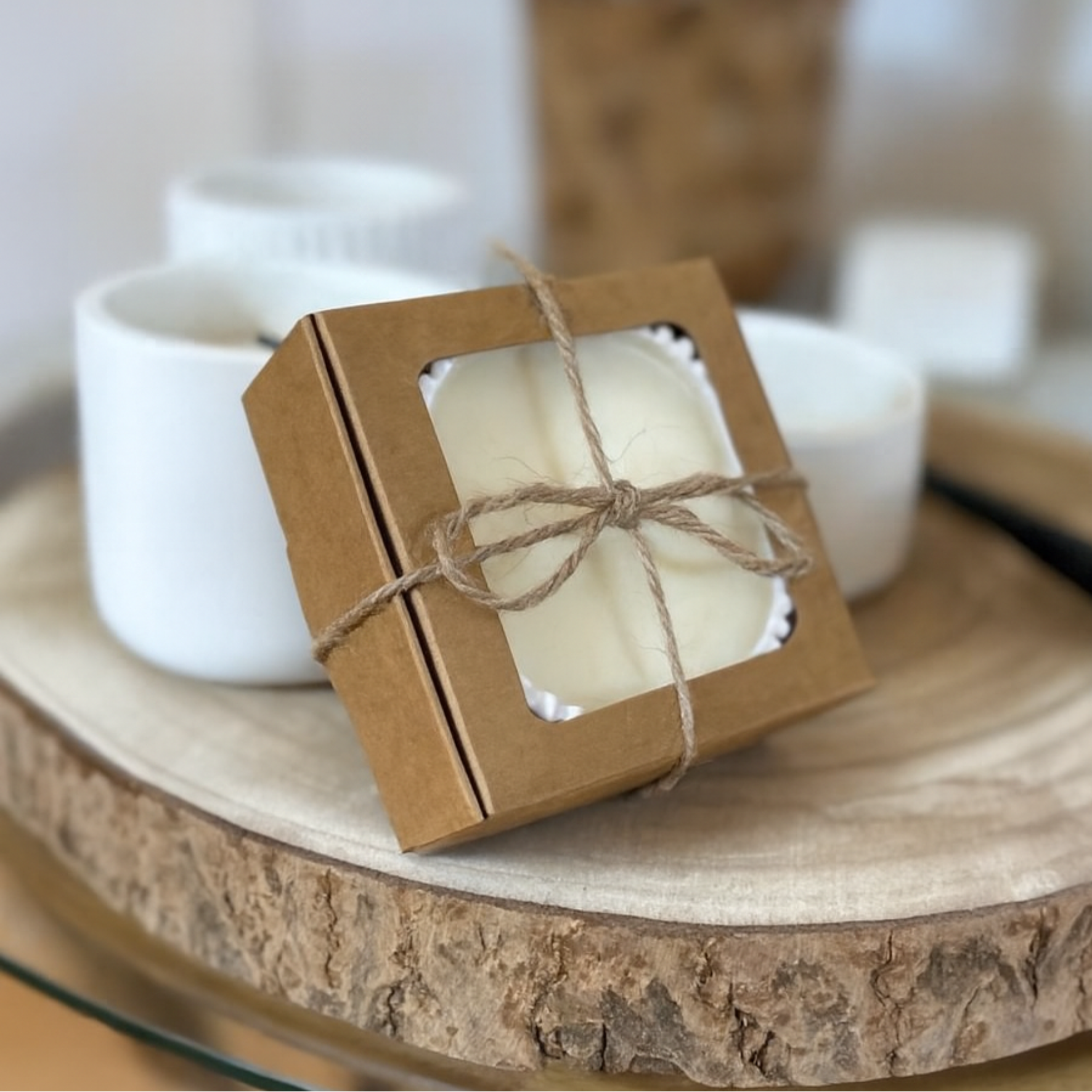 Un detalle pensado para transmitir calma, presencia y agradecimiento. Esta cajita kraft con ventanita deja ver una vela artesanal creada a mano, lista para regalar un pequeño momento de bienestar.