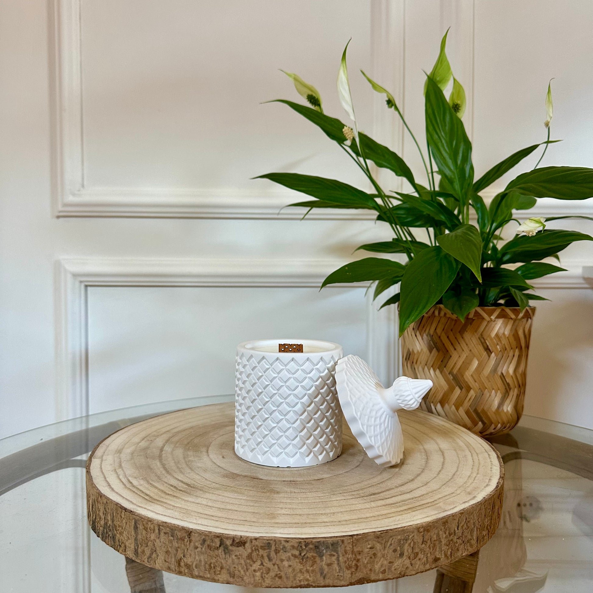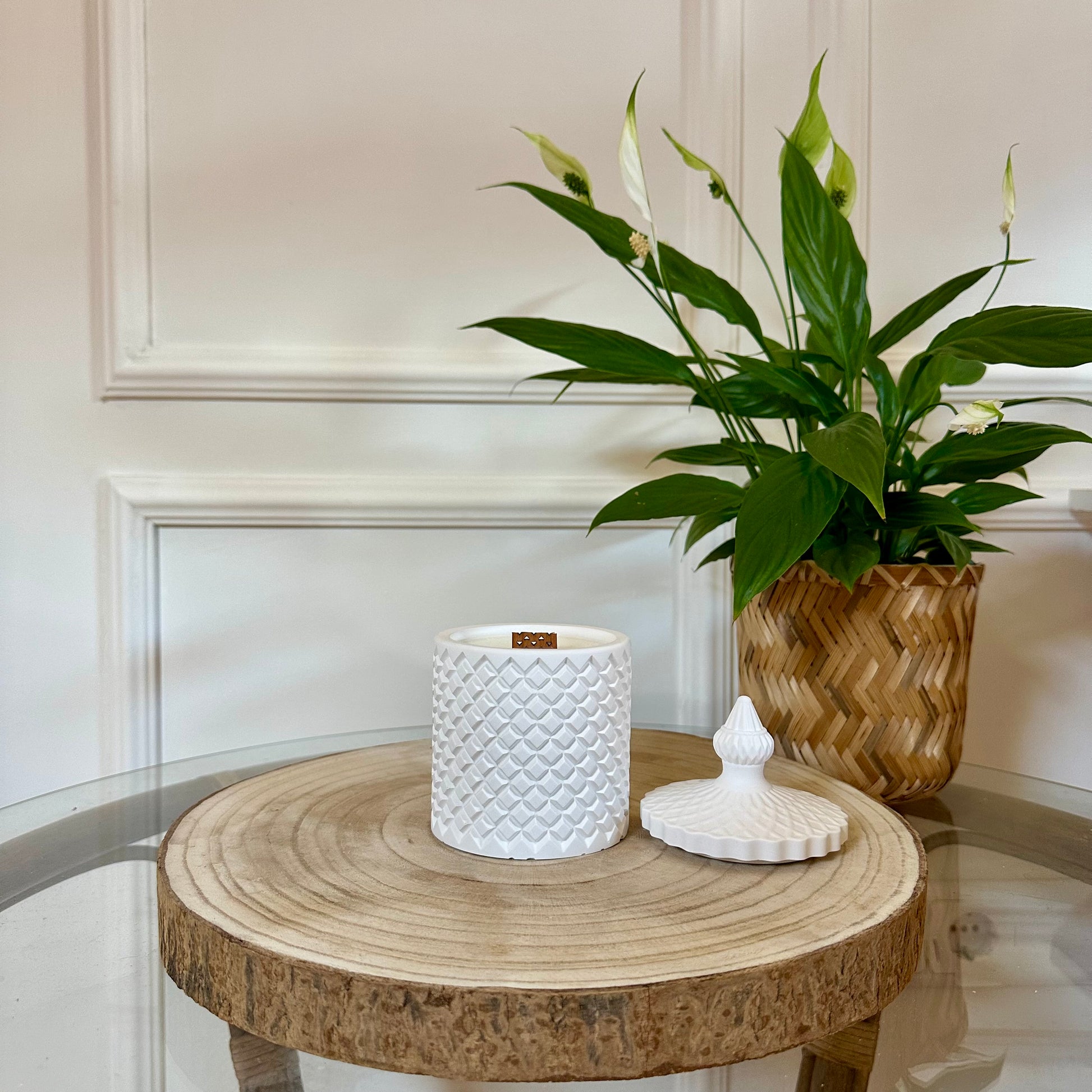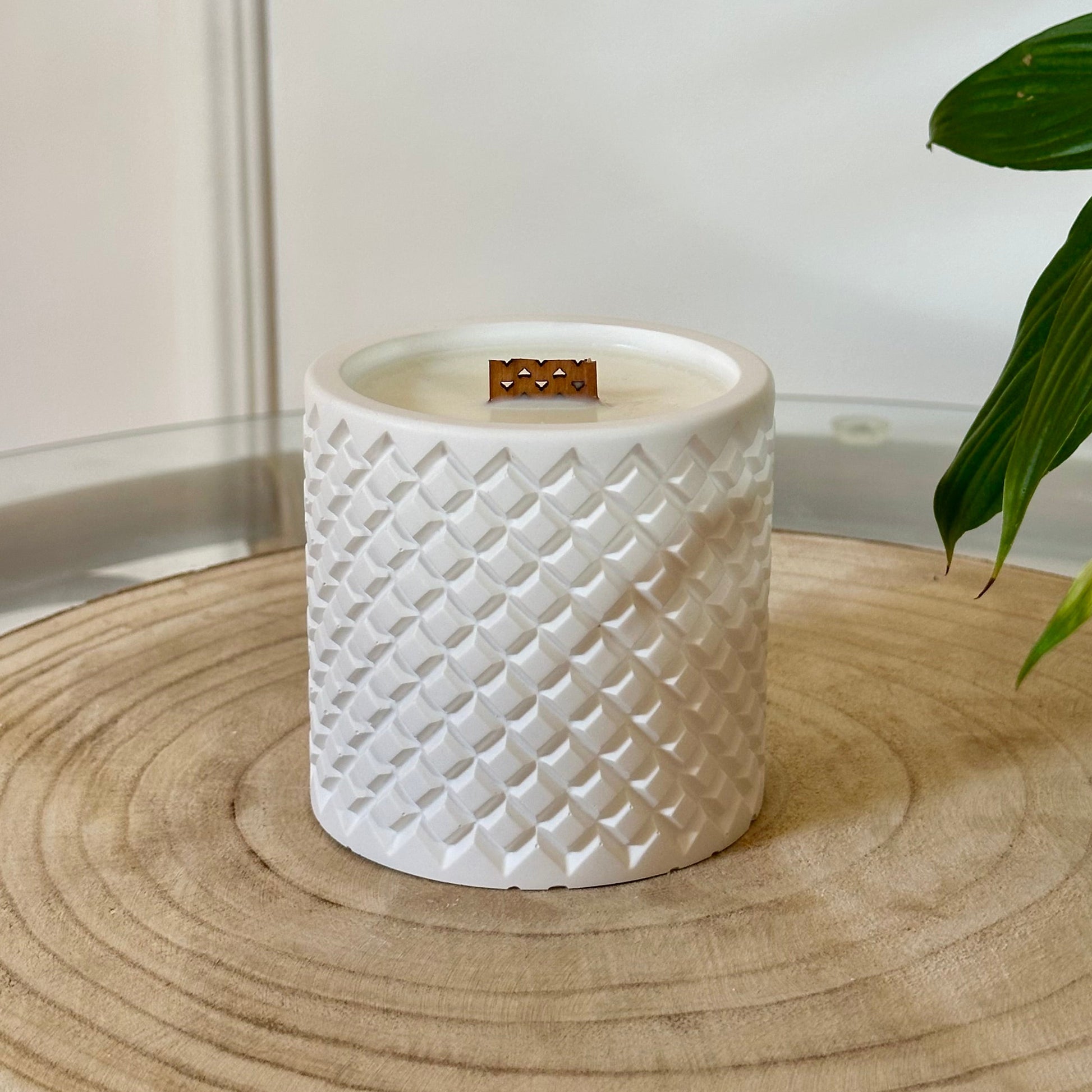 Nuestra Vela Grande Rombos sin aroma es una pieza decorativa que destaca por su recipiente con líneas de rombos pequeños y su tapa espectacular en forma de pináculo, aportando un estilo único y elegante a cualquier espacio. La mecha crepitante proporciona una llama cálida y uniforme, llenando el ambiente de un delicado sonido que recuerda al fuego al arder.