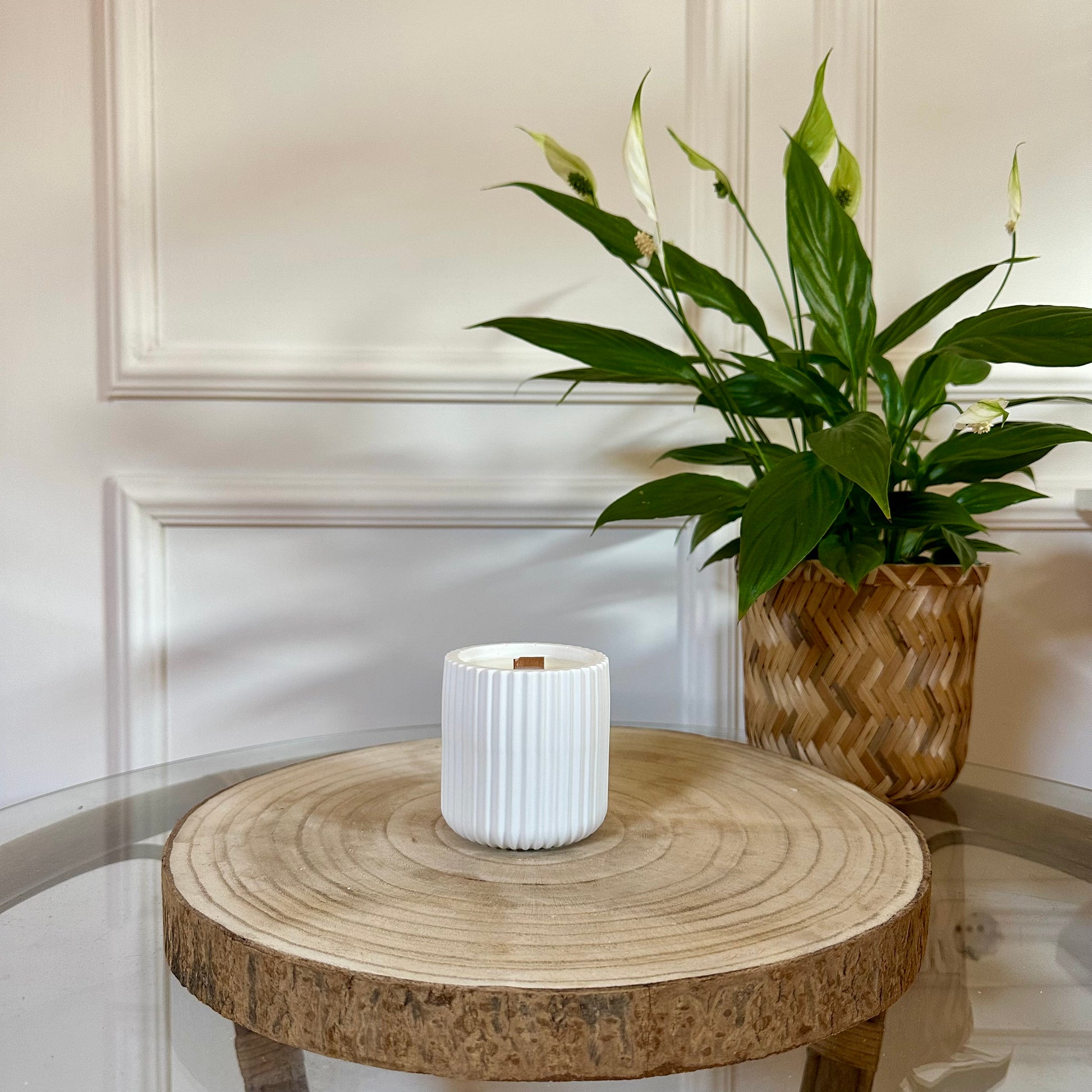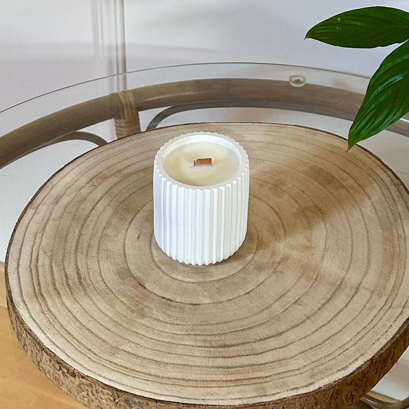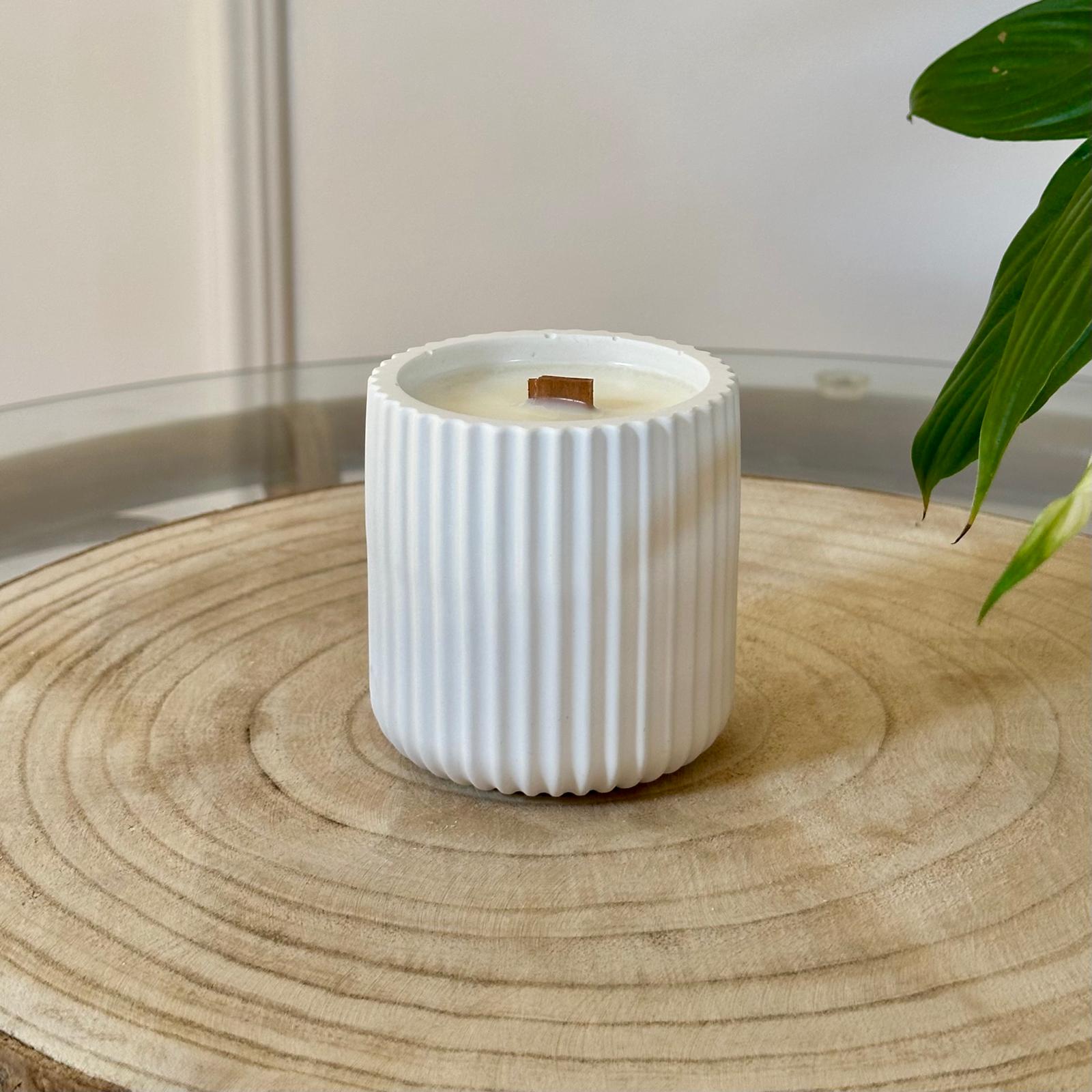 Nuestra Vela Mediana Rayada sin aroma combina diseño, luz y calidez, convirtiéndose en una pieza decorativa única para cualquier espacio. Su recipiente más alto y estrecho, con líneas verticales ralladas, aporta un estilo elegante y sofisticado, mientras que su mecha crepitante crea un ambiente acogedor con un delicado sonido que recuerda al fuego al arder.