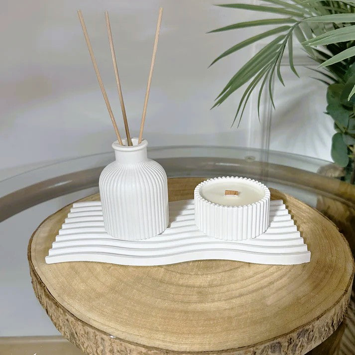 Una pieza elegante artesanal en resina ecológica. Sus líneas onduladas aportan modernidad y suavidad, perfecta para colocar velas, joyas, tu quemador de esencias o usarla como objeto decorativo por sí misma.