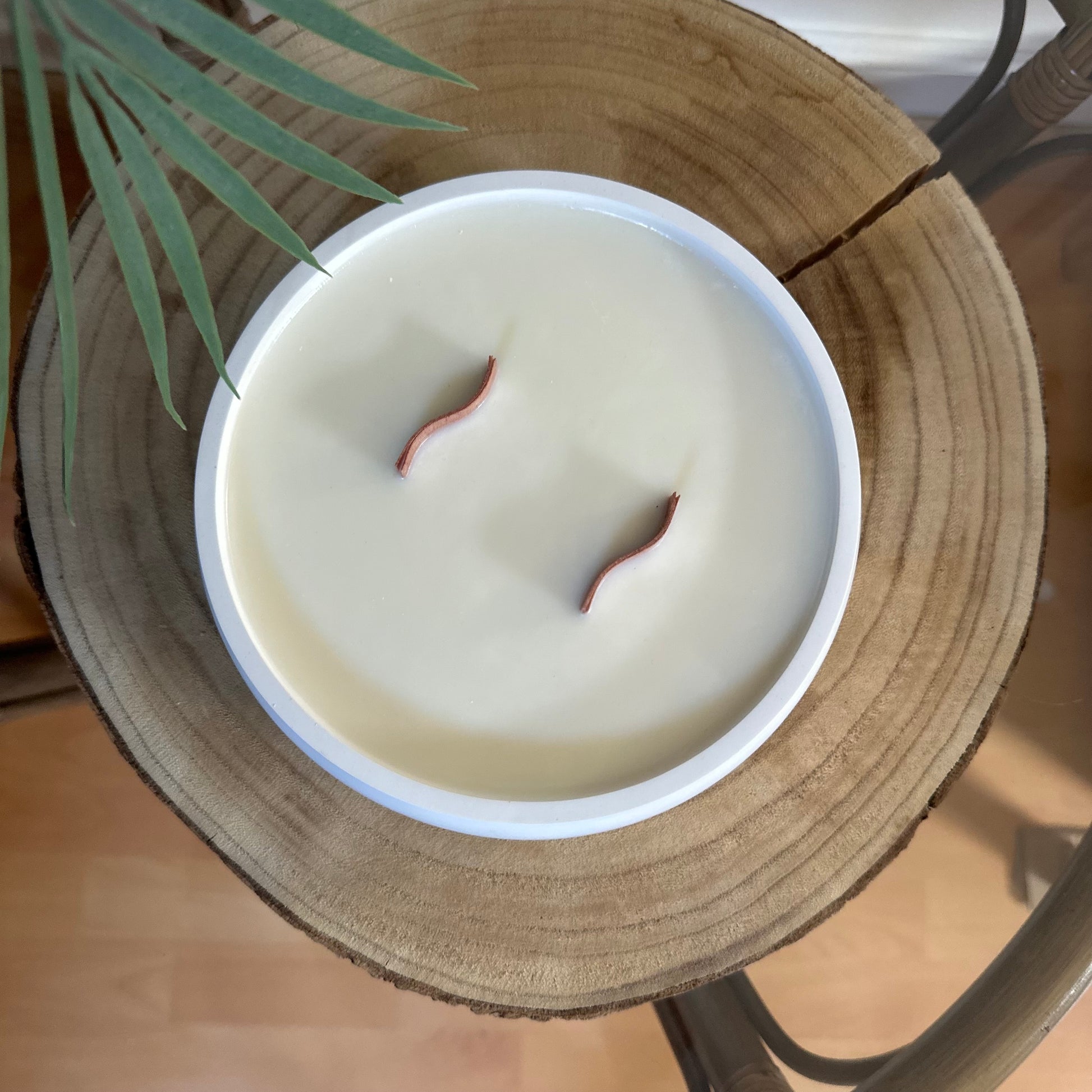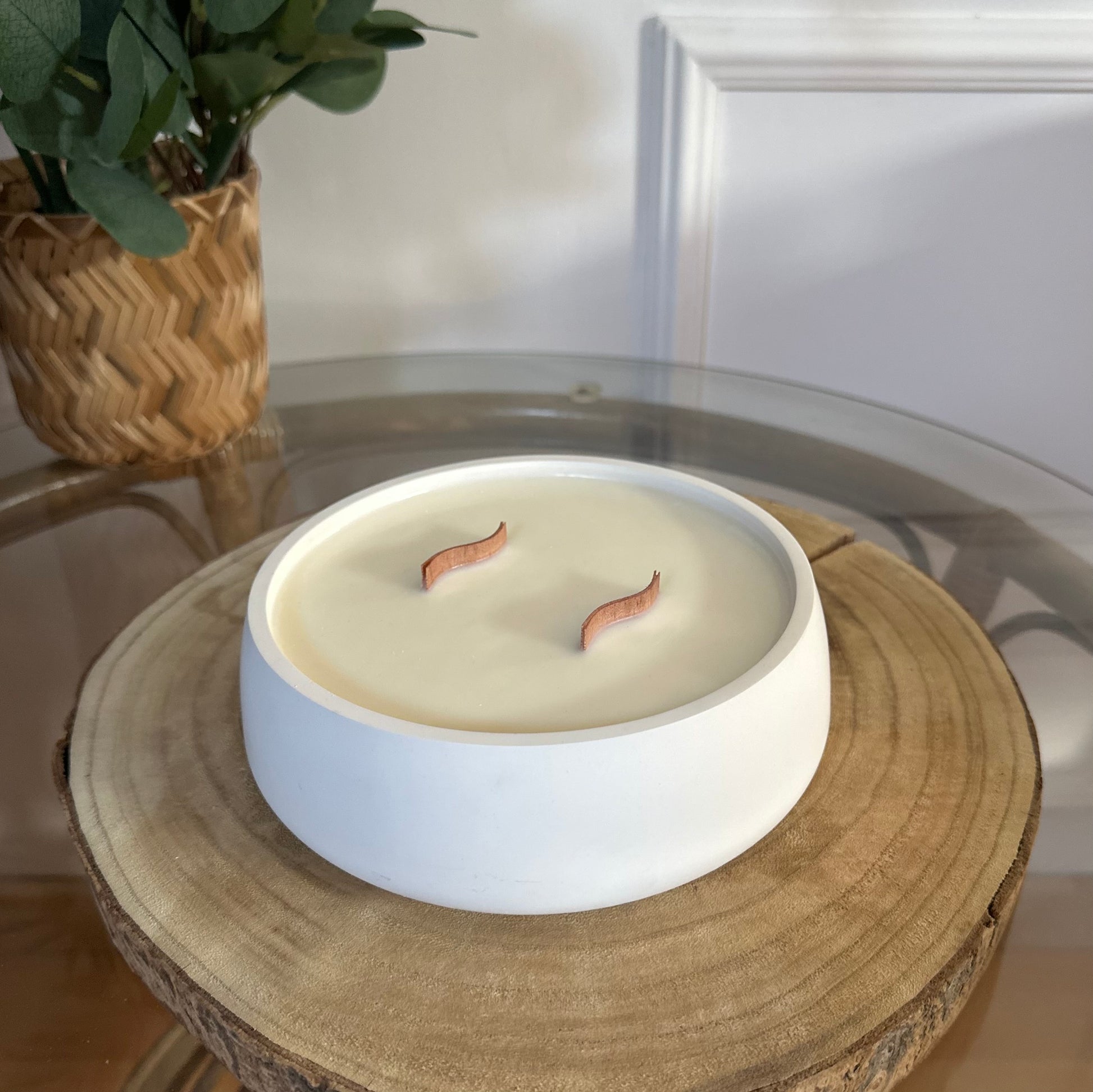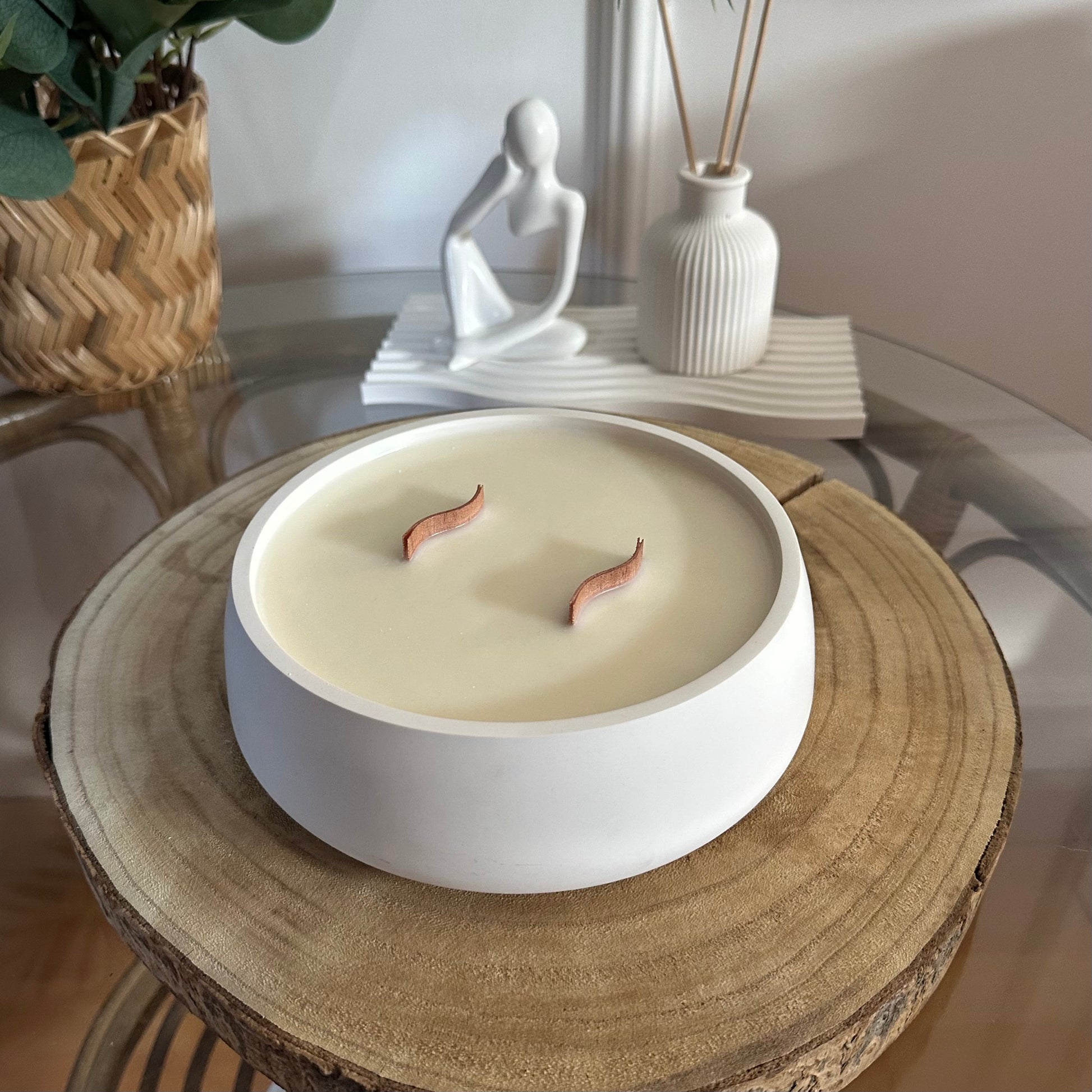 Nuestra vela XXL redonda está creada para envolver cualquier espacio con una luz cálida, un sonido relajante y un aroma que invita a desconectar. Su recipiente artesanal, elaborado en resina ecológica, combina diseño y sostenibilidad, mientras que sus dos mechas onduladas de madera ofrecen una llama uniforme y un crepitar más intenso, evocando el sonido del fuego al arder lentamente.