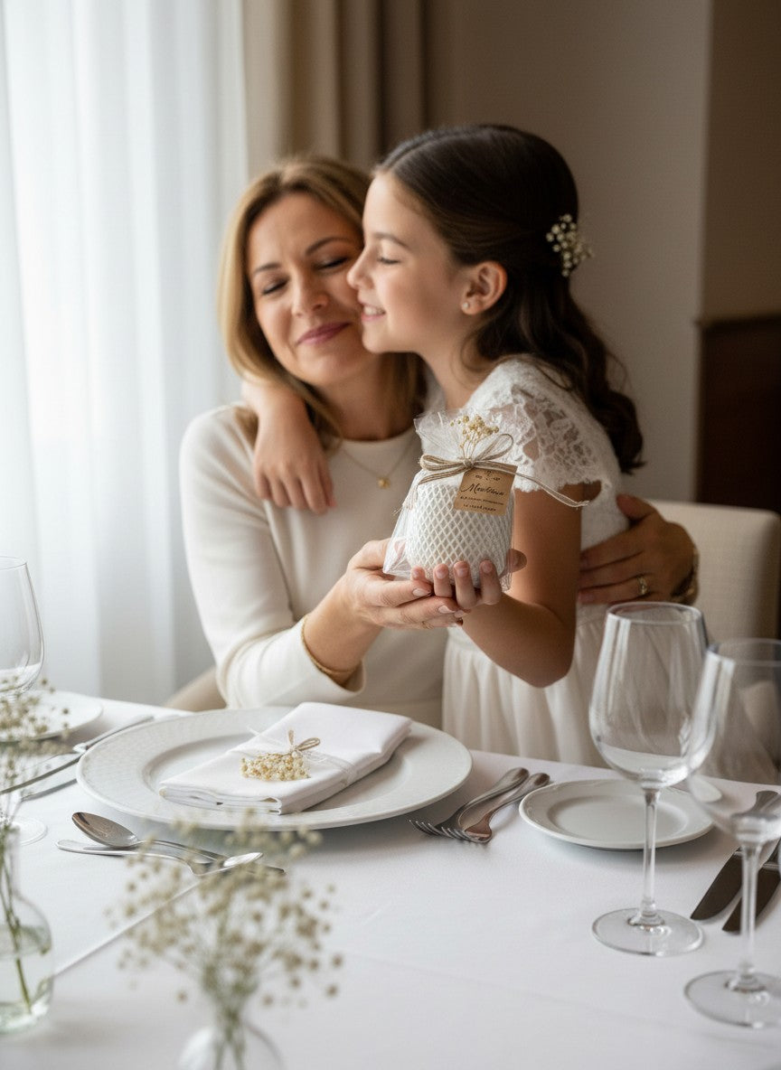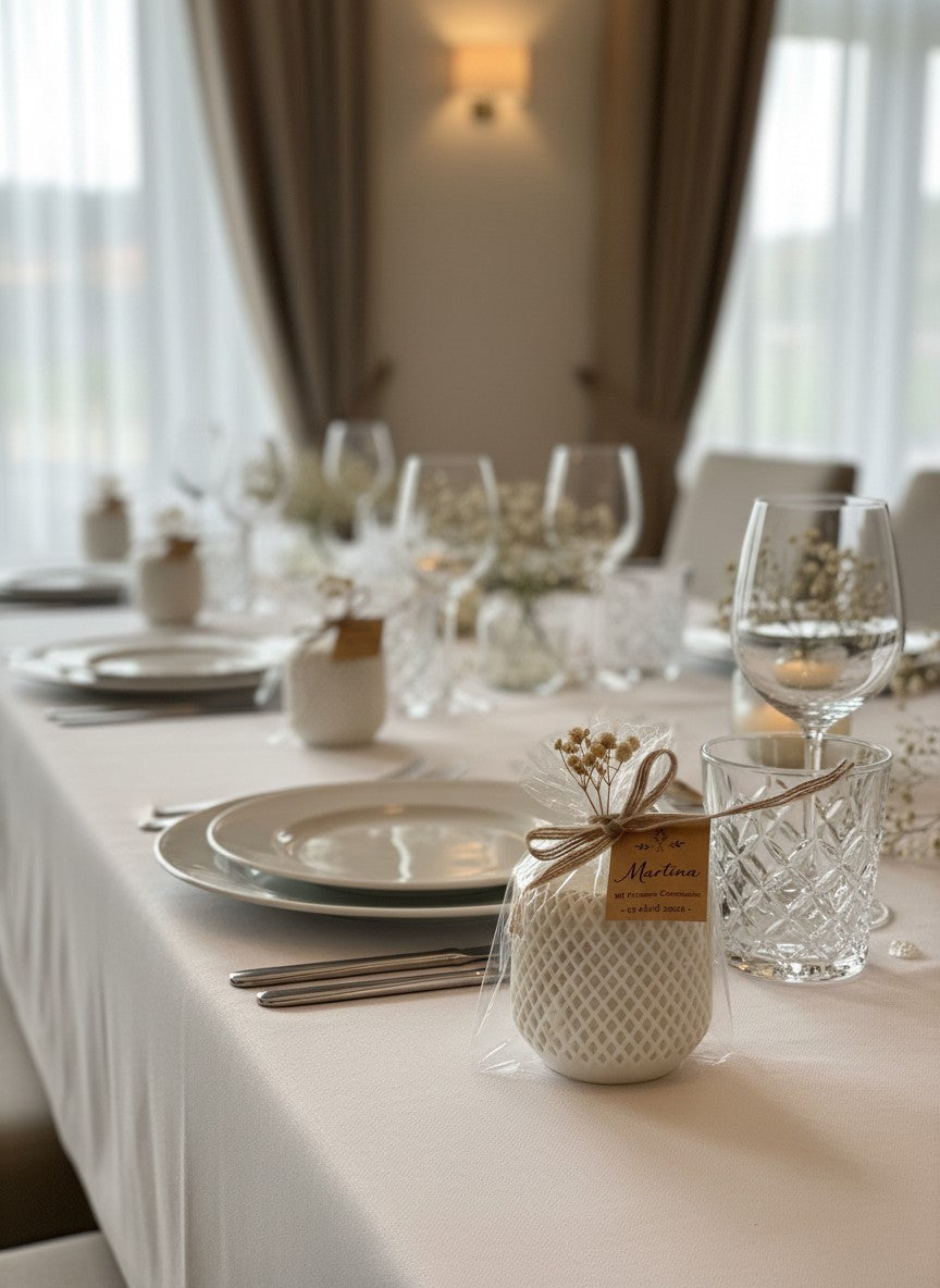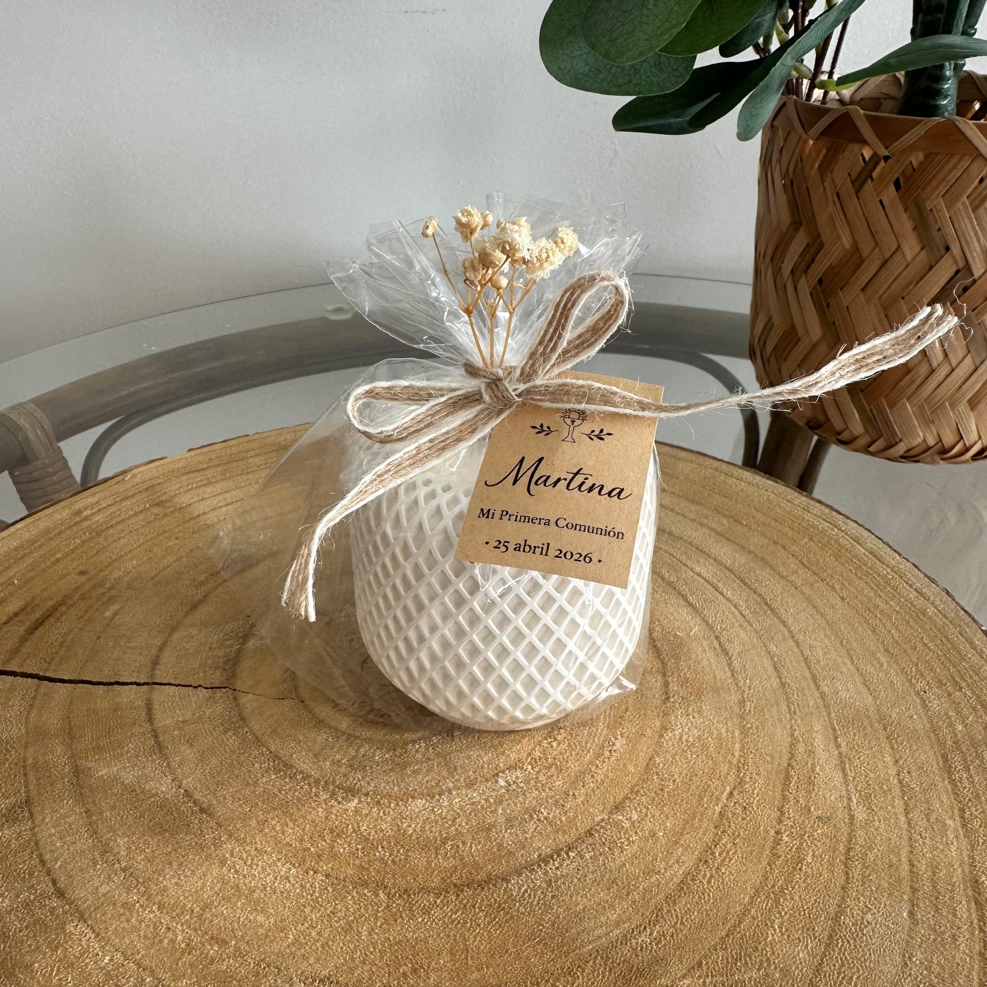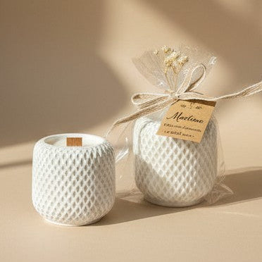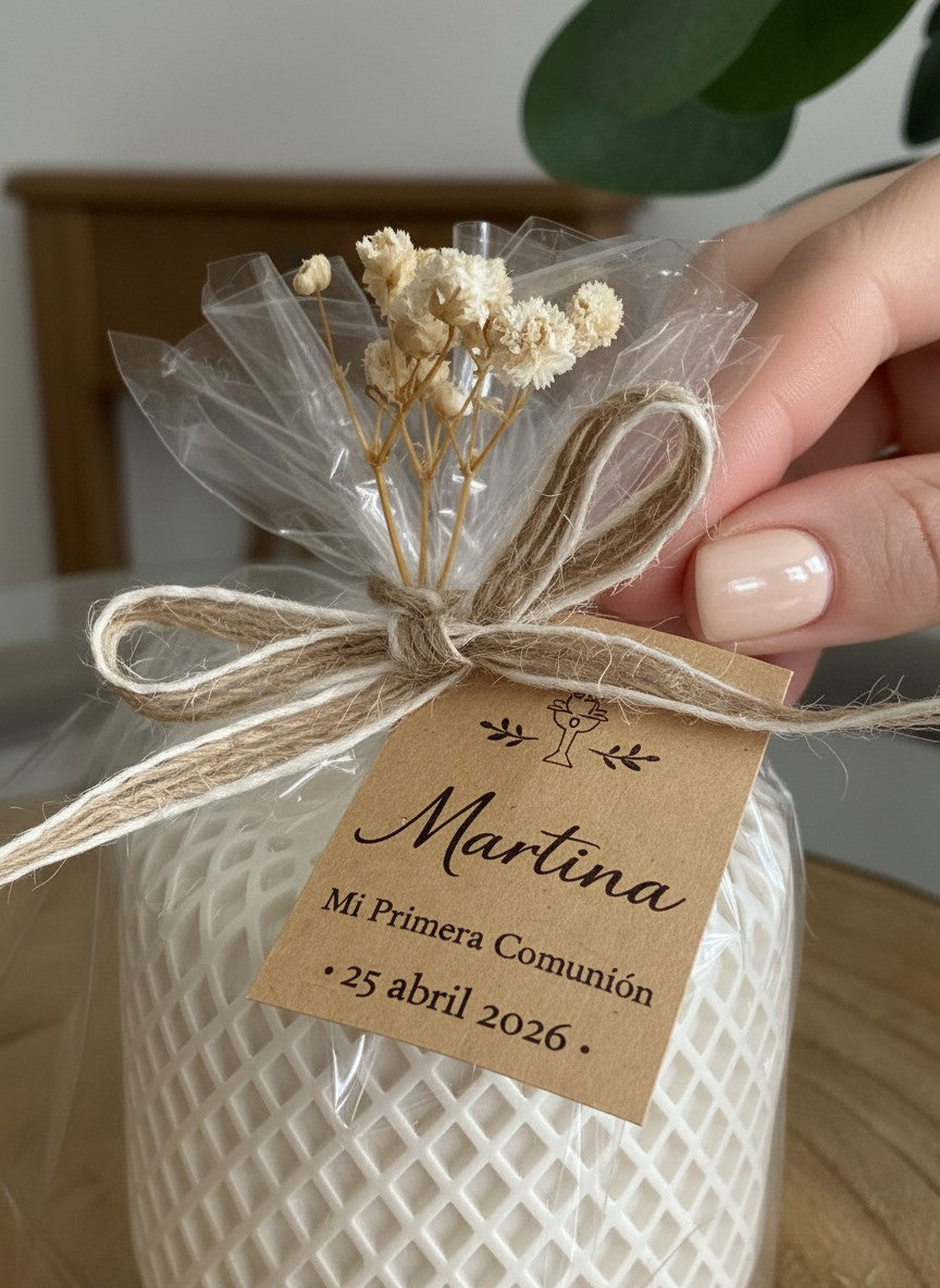Vela aromática hecha a mano con cera de soja 100% natural y mecha de madera crepitante, presentada en papel celofán que aporta luminosidad y claridad. Terminada con cuerda de yute premium, flor de paniculata y etiqueta personalizada. Producto totalmente artesanal, incluyendo el recipiente, con detalles delicados y elegantes que convierten este regalo en un momento especial para disfrutar.